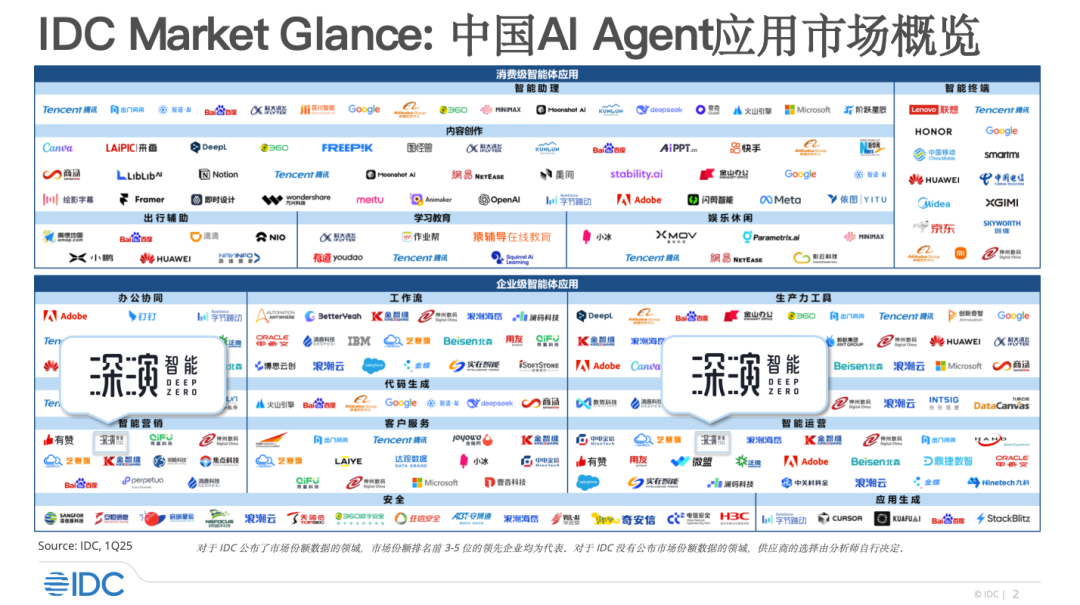 近期,国际数据公司(IDC)正式发布了《IDC Market Glance:中国 AI Agent 应用市场概览,1Q25》(Doc#CHC53057625,2025 年 3 月)研究报告,金数据智能凭借在 AI 应用领域多年的经验沉淀,以及在 AI 智能体的全方位战略布局,成功入选了报告「智能营销」与「智能运营」两大核心板块。