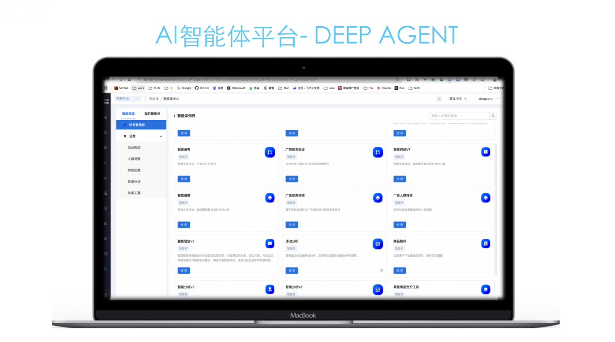 - 最后,依托深耕消费品、金融、汽车等领域十年的经验,Deep Agent 内置 300 多个行业决策模型与海量的场景化解决方案,为企业给予从数据治理到营销触达的一站式服务。