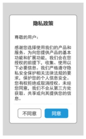 App首次运行时应当有隐私弹窗,隐私弹窗中应公示简版隐私政策内容,明示收集使用个人信息的目的、方式和范围,并附完整版隐私政策链接,并确保《隐私政策》链接正常有效,易于访问和阅读。隐私弹窗应明确提示最终用户阅读并选择是否同意隐私政策,应给予同意按钮和拒绝同意的按钮,并由最终用户主动选择。